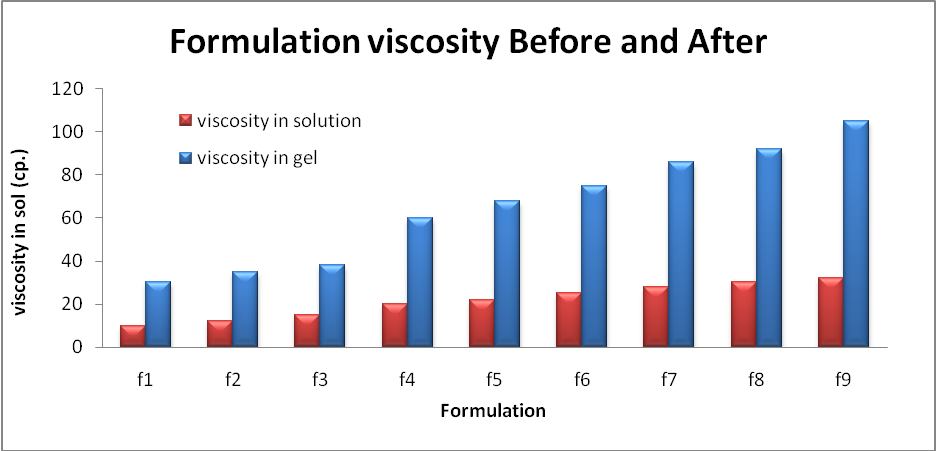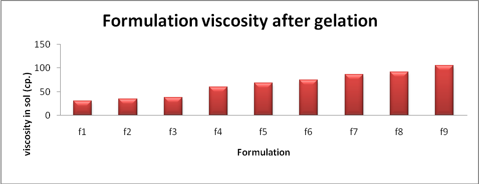 Viscosity of the prepared formulations was measured by using Brookfield Cone and Plate Viscometer. The suitable spindle was lowered perpendicularly into the fixed volume of gel which was to be measured. The spindle was rotated at varying speeds and the suitable speed was selected. The temperature was maintained at 25°C and then the viscosity was measured as the system was allowed to cool gradually (fig. 6, 7).