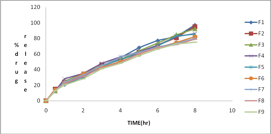 Acceptable range for all the formulations. % drug content was in the range 95- 97 % indicating uniform distribution of drug. (Table 5) shows the result of percentage drug for all the formulations. The drug content of optimised formulation was found to be in 97.32%.