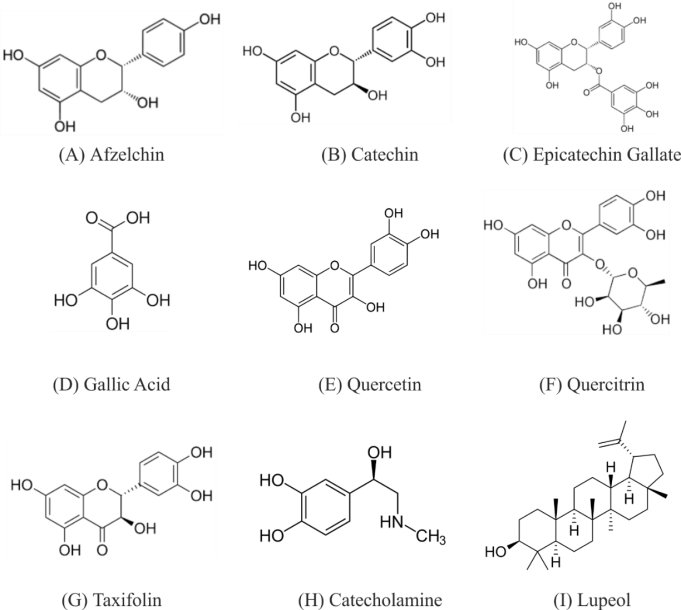 Fig. 1: Chemical structures of (A) Afzelchin, (B) Catechin, (C) Epicatechin gallate, (D) Gallic acid, (E) Quercetin, (F) Quercitrin, (G) Taxifolin, (H) Catecholamine (I) Lupeol