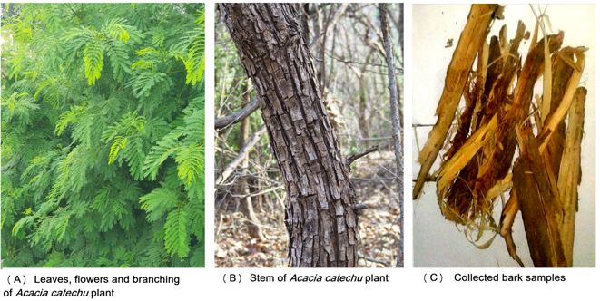 Fig. 2: Morphology and collected bark samples from the Acacia catechu plant