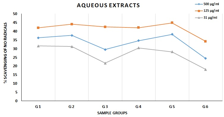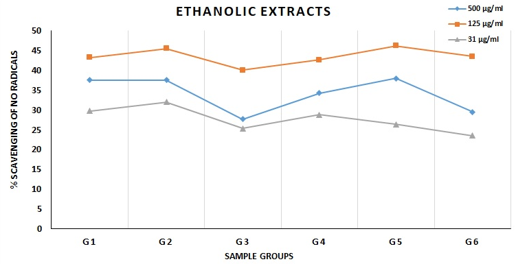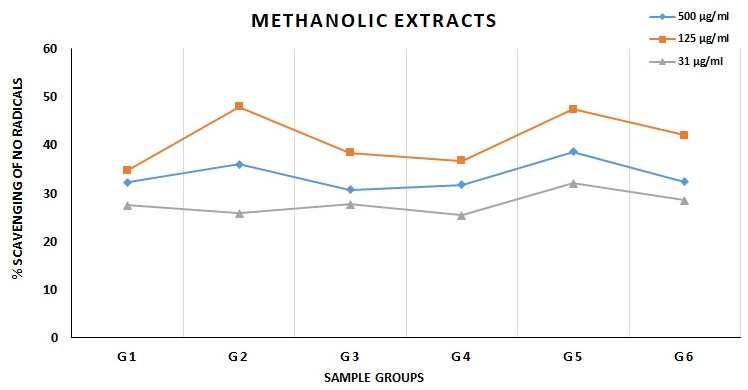 When antioxidative activities that depend on concentration were looked into, it was found that almost all samples worked best when the medication concentration was 125 µg/ml. The medication concentration of 15.25 µg/ml was shown to be ineffective for all of the test samples. Interestingly, it was shown that the medication doses of 1000, 750, and 500 µg/ml consistently exhibited lower levels of protection compared to the 125 µg/ml concentrations across many test samples. It is worth mentioning that, in the majority of instances, concentrations of 31.5 and 62.5 µg/ml, as well as 125 and 250 µg/ml, showed little alterations in their ability to scavenge nitric oxide (NO). Consequently, the values representing the scavenging activity of the test extracts at concentrations of 31.5, 125, and 500 µg/ml have been provided in this context (table 2).