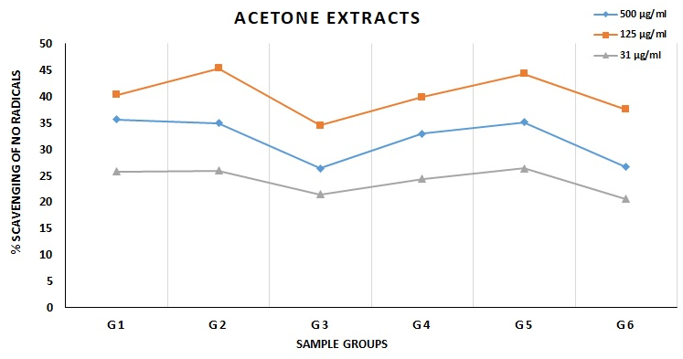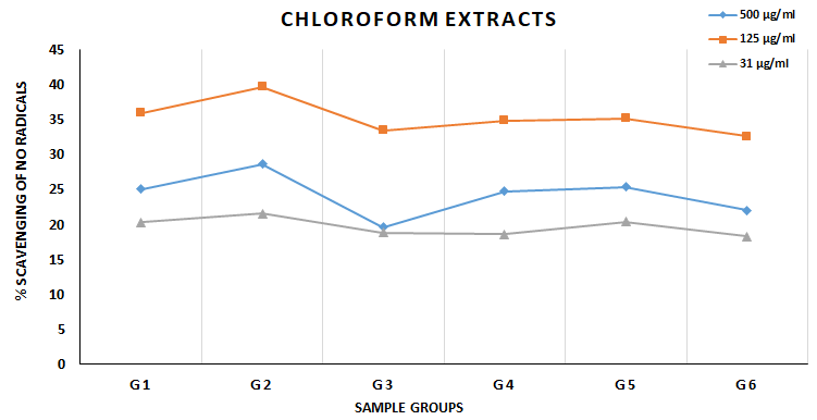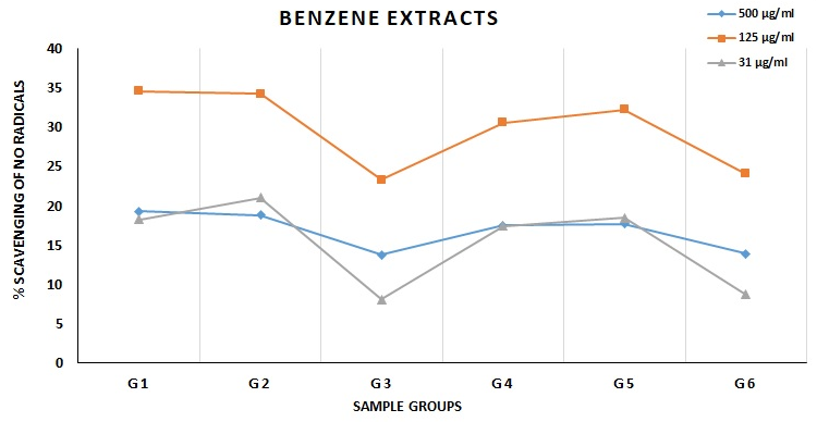 The study of solvent-dependent antioxidative activities revealed clear-cut differences among the results. At the same drug concentration, ethanolic (fig. 3), methanolic (fig. 4), and aqueous (fig. 5) extracts of the same sample group were seen to have significant and equal protection against test parameters; these exhibited p<0.001 significantly greater efficacy than chloroform (fig. 7) and benzene (fig. 8) extracts at 31.5 and 500 µg/ml drug concentrations, while at 125 µg/ml drug concentration the chloroform and benzene extracts were also seen to exhibit significantly high NO scavenging. On the other hand, the acetone extracts have been observed to exhibit moderate No scavenging potential (fig. 6), as it showed relatively lesser protection than ethanolic, methanolic and aqueous extracts (p<0.05 or more); while greater protection than chloroform and benzene extracts (p<0.01 or more) at almost all tested concentrations.