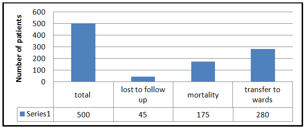 Out of 500 patients enrolled, 280 patients were transferred to the ward, mortality was seen in 175 patients and 45 patients were lost to follow up, thus the data were analyzed for 455 patients (table 2, fig. 1).