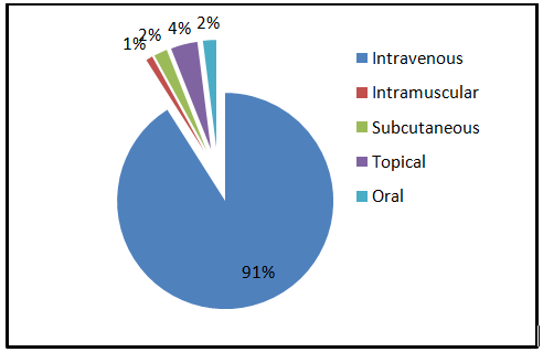 Most commonly preferred dosage form was parenteral (94%) while most common route of antimicrobial administration was intravenous route (>90%) as compared to other route(s) (table 3, fig. 3).