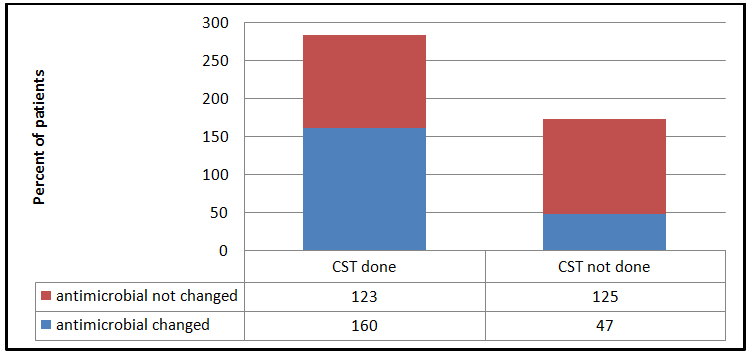 Antimicrobials were started empirically in all the patients. This was followed by a culture sensitivity test (CST), which was carried out in 283 patients out of 455 patients. Of these 283 patients, change in antimicrobial was done in 160 patients after CST report. Of the 172 patients in whom CST was not done, change of antimicrobial was done in 47 patients, which included the use of restricted higher antimicrobials like piperacillin+tazobactam, ceftazidime, cefepime, prulifloxacin, amikacin, meropenem, vancomycin. Change of antimicrobials following CST was statistically significant (p<0.005) by chi square test when compared to group in whom antimicrobials were changed without CST (table 4, fig. 4).