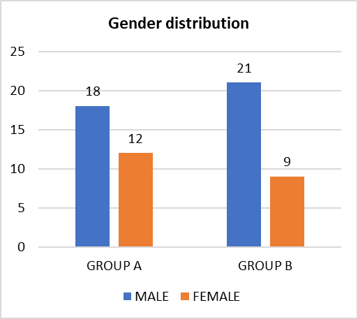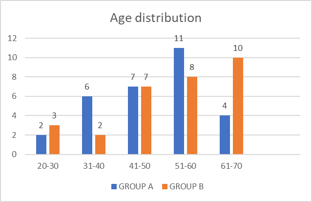 The mean age of the study subjects was 50.3±12.2 in Group A and 52.8±12.7 in Group B. No significant difference was noticed (p=0.96). The majority were males in both group A and group B, with 60% and 70% respectively.