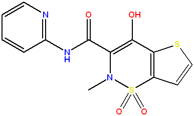 Tenoxicam (fig. 1) is an enolic acid derivative that inhibits high levels of COX-2 at the sites of inflammation and thus has anti-inflammatory, analgesic, and antipyretic activity. This nonselective COX inhibitor is extensively used in the treatment of rheumatoid arthritis and osteoarthritis. Chemically, tenoxicam is 4-hydroxy-2-methyl-N-2-pyridinyl-2H-thieno(2,3-e)-1,2-thiazine-3-carboxamide 1,1-dioxide with pKa 4.50 and 3.73 [1-6].