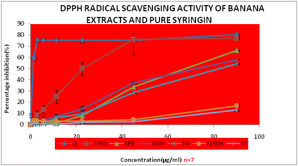 Conclusion: The results generated from this study showed that tepal banana extracts possess very good radical scavenging activity and as well the largest amount of phenolic contents, which could introduce phenols as the main radical scavenger in banana extracts and offering effective protection from free radicals, and the antioxidant activity of pure syringin was not obvious may be due to the presence of highly anti oxidative compounds present in banana, phenolics and flavonoids.