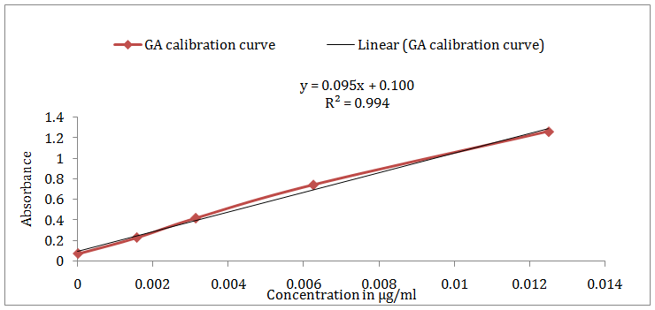 Total phenolic content was determined according to the method of Singleton and Rossi [20] spectrophotometrically with some modifications. In brief, 0.25 ml of 1000 µg/ml samples was pipetted into a test tube followed by the addition of Folin-Ciocalteu’s reagent (1:10 dilution) and incubated for 2-5 min. 1 ml of Sodium carbonate (7.5%) was added to the above mixture and incubated for 30 min. The absorbance of the color formed was measured at 760 nm against the blank sample. The measurements were compared to a standard curve of prepared gallic acid solutions (12.5, 6.25, 3.125 and 1.3625µg/ml). All measurements were performed in triplicate.