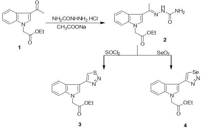 Oxidative cyclization of compound 2 either with thionyl chloride or selenium dioxide led to the formation of ethyl 2-(3-(1, 2, 3-thiadiazol-4-yl)-1H-indol-1-yl)acetate (3) and ethyl 2-(3-(1, 2, 3-selenadiazol-4-yl)-1H-indol-1-yl)acetate (4), respectively, Scheme 1. 1H NMR of compounds 3 and 4 lacked the presence of singlet signals at δ 2.23, 6.36 and 9.12 ppm of compound 2 and revealed new singlet signals at 8.44 and 5.58 ppm due to thiadiazolyl H-5 and selenadiazolyl H-5, respectively.
