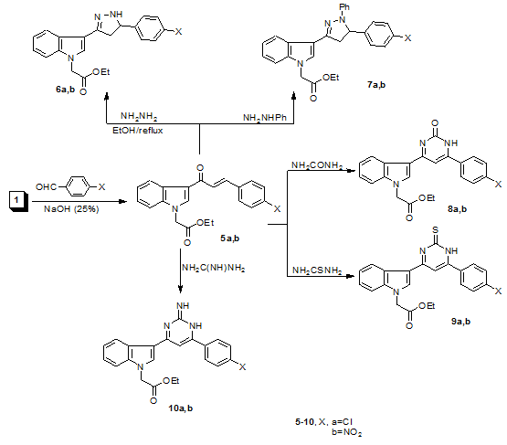 Methods: Reaction of ethyl 2-(3-acetyl-1H-indol-1-yl) acetate (1) with semicarbazide hydrochloride yielded semicarbazone derivative 2. The oxidative cyclization of 2 using thionyl chloride and selenium dioxide afforded 1, 2, 3-thia and 1, 2, 3-selenadiazole derivatives 3 and 4, respectively. On the other hand, reaction of 1 with 4-chloro and 4-nitrobenzaldehydes under Claisen-Schmidt conditions gave α, β-unsaturated keto derivatives 5a, b. Cyclization of 5a, b using hydrazine hydrate, phenyl hydrazine, urea, thiourea or guanidine led to the formation of pyrazoles 6a, b, 7a, b, and pyrimidines derivatives 8a, b-10a, b; respectively. Condensation of 1 with phenyl hydrazine followed by Vilsmeier Haack formylation gave pyrazole-4-carboxaldehyde derivative 12. Reaction of aldehydic function group of 12 with different reagents led to the formation of pyrazol-5-ones 14-16, thiazolidinone 18, aziditine 19, 1, 6-diaminopyridine 21, triazolo(1, 5-a)pyridine 22 and pyrano(2, 3-c) pyrazole derivatives 23. The in vitro antiviral activity of the selected compounds 6a, b 7a, b 8a, b 9a, b and 10a, b was studied against Marek's disease virus (MDV).