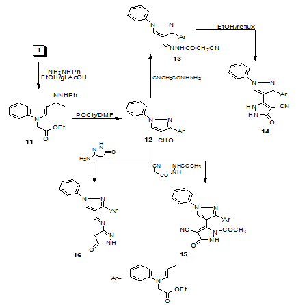 Condensation of 12 with 2-cyanoacetic acid hydrazide in glacial acetic acid under stirring at room temperature led to the formation of hydrazone 13 which on heating in absolute ethanol containing triethylamine as a catalyst yielded 4-cyano-2, 3-dihydro-3-oxo-1H-pyrazole derivative 14. On the other hand, reaction of 12 with 2'-acetyl-2-cyanoacetohydrazide under reflux in absolute ethanol and in the presence of triethylamine as a catalyst afforded 1-acetyl-4-cyano-2, 3-dihydro-3-oxo-1H-pyrazole derivative 15, Scheme 3. Moreover, acid catalyzed reaction of 12 with 3-amino-5-pyrazolone under reflux in absolute ethanol gave ethyl 2-(3-(4-(4, 5-dihydro-5-oxo-1H-pyrazol-3-ylimino)methyl)-1-phenylpyrazol-3-yl)-1H-indol-1-yl) acetate (16), Scheme 3.