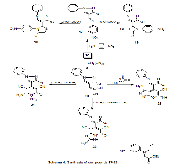 Acid catalyzed reaction of 12 with 4-nitroaniline yielded the corresponding Schiff base 17. Compound 17 reacted either with thioglycollic acid or chloroacetyl chloride in dry 1, 4-dioxane and gave 4-oxo-3-(4-nitrophenyl)thiazolidine 18 and 3-chloro-1-(4-nitrophenyl)-4-oxo-azetidine derivatives 19, respectively, Scheme 4. On the other hand, base catalyzed reaction of 12 with malononitrile afforded ethyl 2-(3-(4-(2, 2-dicyanovinyl)-1-phenylpyrazol-3-yl)-1H-indol-1-yl)acetate (20) Scheme 4.
