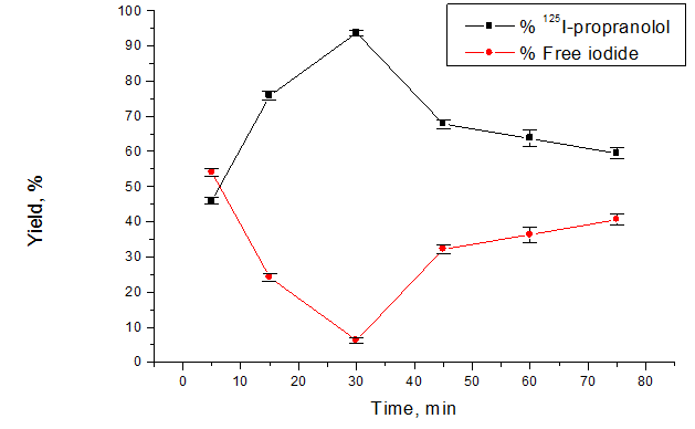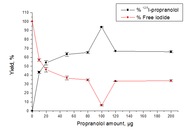The percentage of radiochemical yield was calculated as the ratio of the radio activity of 125I-propranolol to the total activity multiplied by 100 [4].