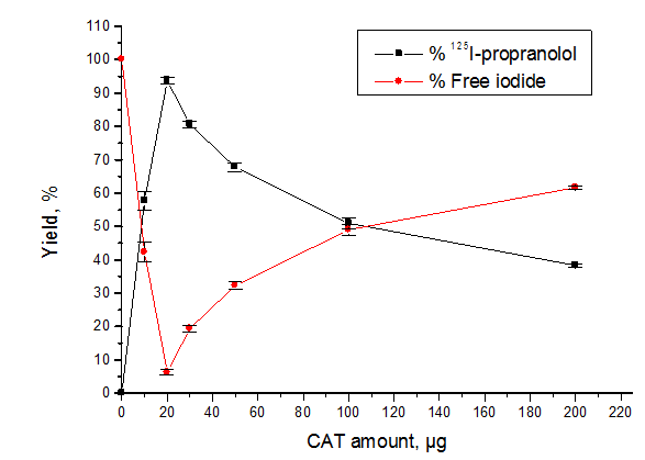 When a low CAT amount (10 µg) was used, labeling yield was very poor (57.67±2.86%). This is because the used amount of CAT was not enough to produce sufficient iodonium species to attack all substrate molecules in the solution. A maximum yield of 125I-propranolol (93.70±0.81%) was achieved using 20 µg of CAT. Further increase in CAT amount resulted in decreasing the radiochemical yield to reach 38.30±5.20% at 200 µg of CAT. The decrease in the radio labeling yield can be attributed to the formation of chlorinated by-products, polymerization or decomposition of the substrate when the amount of CAT exceeded the optimum amount [16].