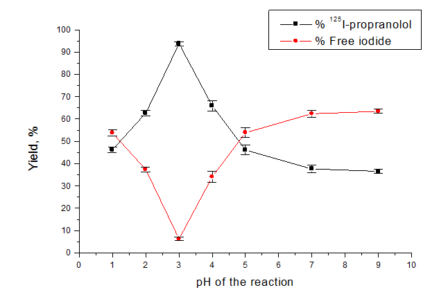 Effect of pH of the reaction mixture was studied using buffers with different pH values. CAT generates different oxidizing species of radioiodine in acidic and alkaline medium. This gives a great importance of pH of the reaction on the labeling yield. In acidic medium, it undergoes hydrolysis to give hypochlorous acid (HOCl). Hypochlorous acid undergoes further hydrolysis to give H2OCl+. The HOCl or H2OCl+generated oxidize the iodine under acidic conditions to the oxidative iodonium (I+) state and thus, rapidly reacts with any electron rich site [4, 18]. Results are depicted in fig. 7. At pH 1 a yield of 46.23±1.30% of 125I-propranolol was obtained. Optimum yield of 93.70±0.81% was obtained at pH 3. This can be attributed to maximum stability of propranolol in pH 3 [19]. At pH 9, radio labeling yield decreased to reach 36.58±0.95%. This can be attributed to the instability of propranolol at neutral or alkaline pH. Another fact to be considered is that, CAT in alkaline medium decomposes to give HOCl and Hypochlorite (ClO-) resulting in the generation of hypoiodite ion (IO-) and iodate (IO3-) which are not the suitable forms for electrophilic radio iodination [20].