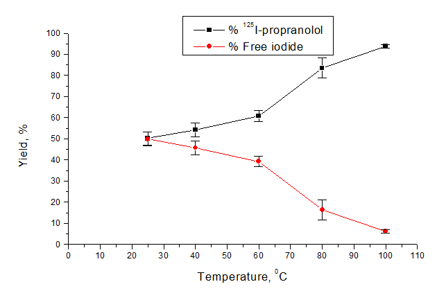 Fig. 8: Variation of the radiochemical yield of 125I-propranolol as a function of reaction temperature; reaction conditions: 10 μl (~7.2MBq) Na125I, 100 μg of propranolol, 20 μg of CAT, at pH 3, the reaction mixtures were kept at different temperatures for 30 min
