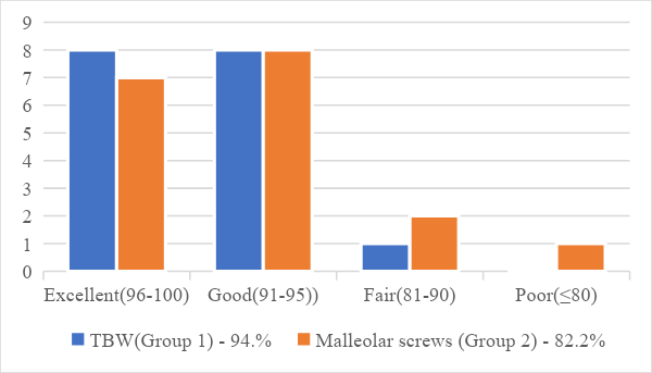 According to Baird and Jackson scoring system, our study results were found to be 94% of excellent and good results in group 1(TBW) patients and 82.2% of excellent and good results in group 2 (Malleolar Screws fixation). Similar observations were seen in Shenkeshi et al. study [11], with 93.26% excellent and good outcomes in TBW and 79.9% in Malleolar Screws fixation patients. Other studies like Mohammed et al. study [7], Sung Hanko and Young-Junpack and Al-Lamy Al-Obaid et al. [12, 13], also observed a higher percentage of outcomes in patients managed with TBW compared to patients managed with Malleolar Screws fixation.