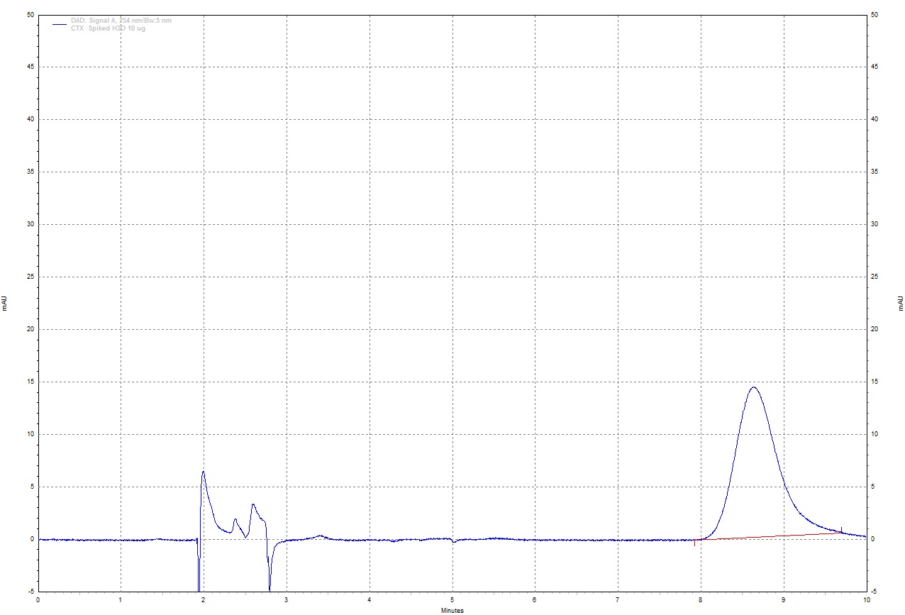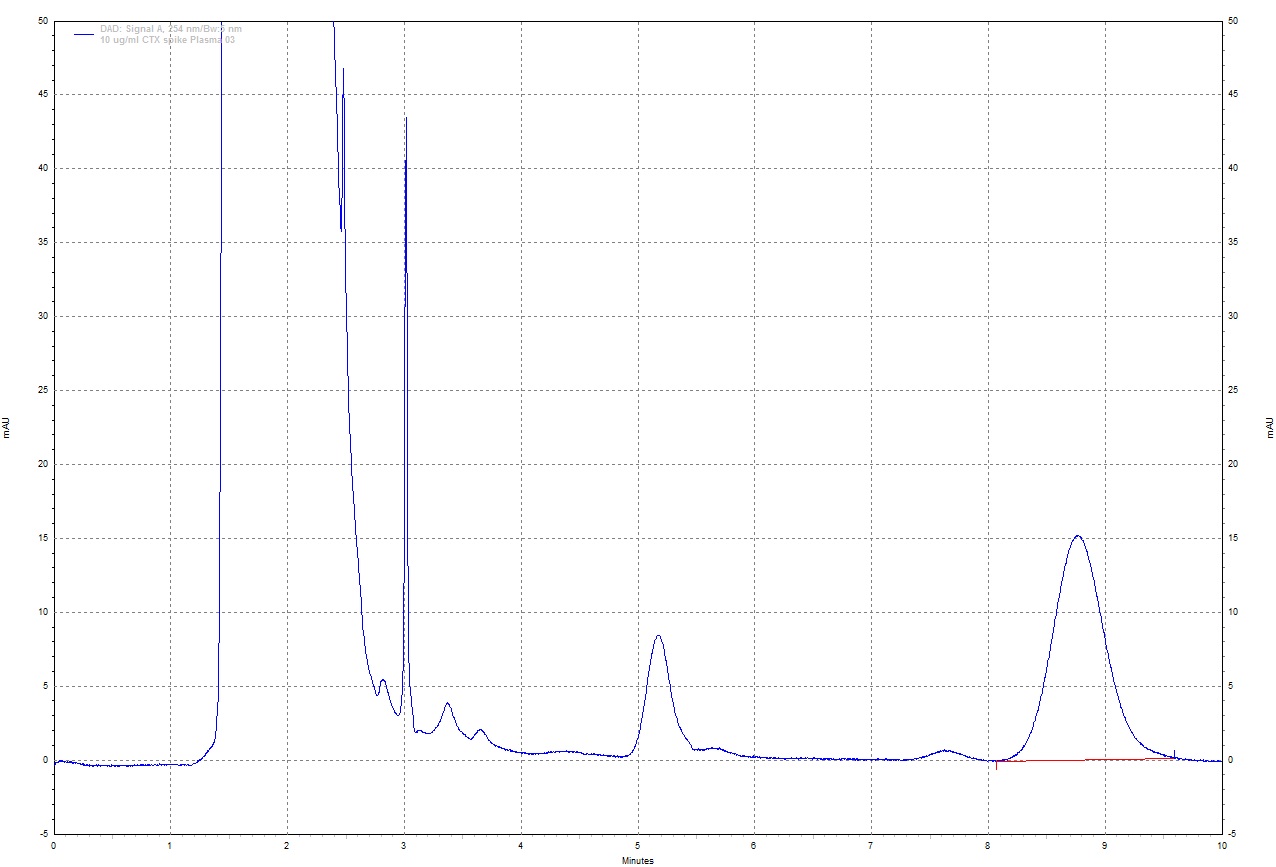 Chromatograms of water spiked with 5μg/ml NaCTX, plasma spiked with 5μg/ml NaCTX and plasma free of NaCTX are shown in fig. 2. The NaCTX peak with a retention time of approximately 8.8 min was well-resolved and free from interference from endogenous compounds in rat plasma.