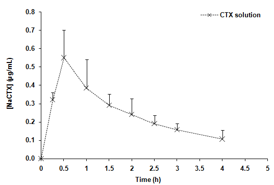 Fig. 3: Plasma concentration-time profiles of NaCTX after oral administration (50 mg/kg) of NaCTX solution to male Wister rats (data are means±S. D., n = 5).