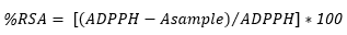 Were %RSA is the percentage of inhibition, ADPPH is the absorbance of DPPH (t=0 min) and Asample is the absorbance of the extract (t=30 min).
