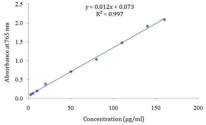 The total phenol in the extracts was estimated by spectrophotometric assay [15]. The protocol of dosage was made as follows: 200 µl of sample (concentration 0.5 mg/ml) or standard was mixed with 1 ml of 1/10th dilute Folin-Ciocalteu’s reagent. After 4 min, 800 µl of aqueous sodium carbonate solution (7.5%) was added. Samples were vortexed and allowed to stand in the dark at room temperature for 2 h. The optical density of the blue-color solution was read at 765 nm. The data presented were averaged for triplicate measurements. A standard curve of the absorbance of Gallic acid (0 to 250µg/ml) at 765 nm was plotted. The results were expressed as milligram Gallic acid equivalent per gram of dry extract (mg GAE/g extract).