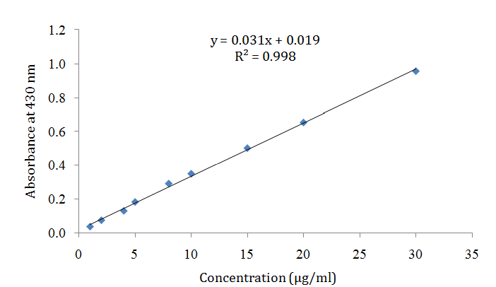 The total flavonoid content of extracts was estimated by a colorimetric procedure using aluminum chloride (AlCl3) according to the method of Bahorun et al. [16]. I milliliter of extract (2 mg/ml) or Quercetin standards (0 to 40µg/ml) was combined with one ml of AlCl3 solution (2% in methanol). The mixture was kept in the dark for 10 min at ambient temperature and the absorbance was read at 430 nm. The test was carried out in triplicate. The results were expressed as milligram quercetin equivalent per gram of dry extract (µg QAE/mg extract).