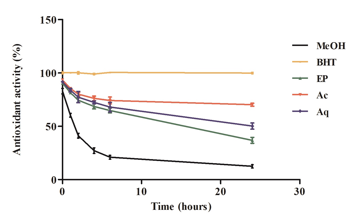 fig. 3 showed the comparative β-carotene bleaching rates of the standard (BHT), extracts and the control (methanol). There was considerable variation in the antioxidant activities. The control had a rapid oxidation of β-carotene. But, all extracts have the capacity to inhibit the oxidation of β-carotene and their antioxidant activities were lower than the standard (BHT). The orders of the antioxidant activity are as follows: BHT>Ac>Aq>EP>Methanol. The most active extract in the lipid peroxidation inhibition assay was ethyl acetate fraction (Ac) with relative antioxidant activity (RAA %) of 70.48±1.6%, followed by the aqueous fraction (Aq) with 50.16±2.9% (table 2). The petroleum ether fraction was the least active extract (36.72±2.76%). The standard (BHT) has the strongest antioxidant activity of 98.88±0.63 %, which is statistically higher than the tested extracts when subject to Turkey’s multiple comparison test (p<0.05).