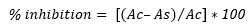Where AC was the absorbance of the control and AS was the absorbance of the sample.
