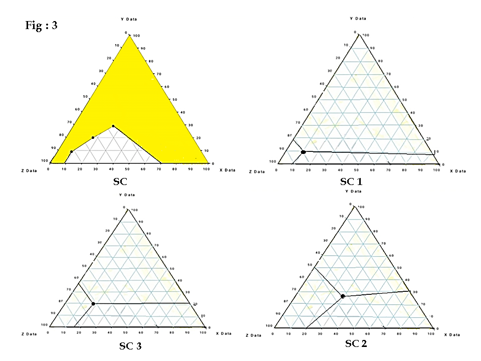 As discussed above following chart has been used to capture the compositional observations concerning various levels of Oil: Smilax china: Water proportion in the nanoemulsion system (table 8).