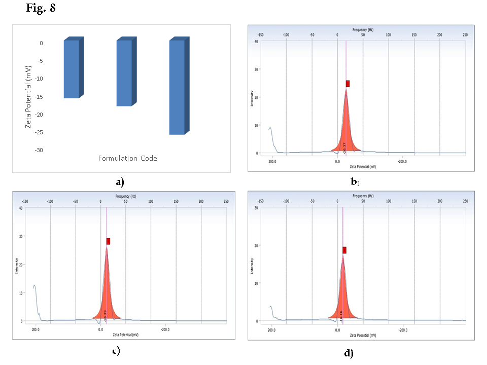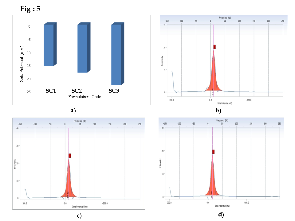 The zeta potential values of all formulations were found in between-16.16 mV to-26.37 mV. The Zeta potential of the optimized batch was found to be-16.16 mV, negative zeta potential due to the negative surface charge of the surfactant tween 80 and co-surfactant propylene glycol. All other SC formulations showed negative zeta potential (fig. 8).