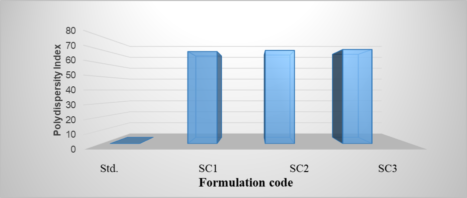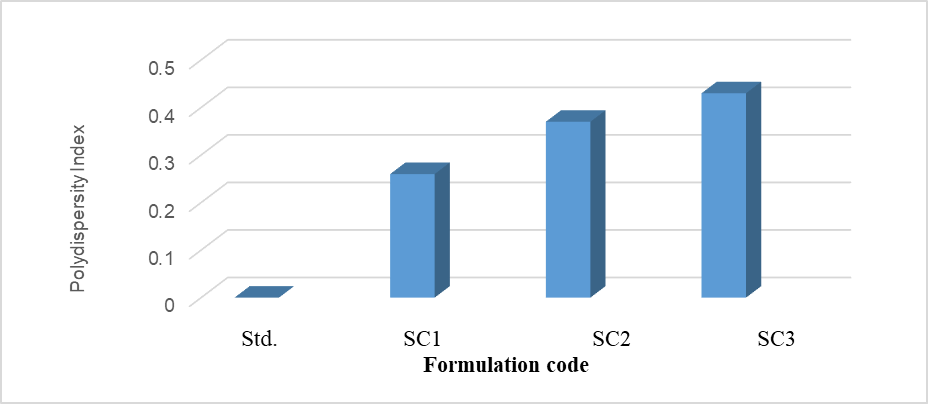 The optimized nanosuspension (SC 1) provides 0.36 PDI. The PDI of all batches was found below 0.5, which suggests that narrow size distribution of particles. The result shows that increase in oil content, there was an increase in PDI.
