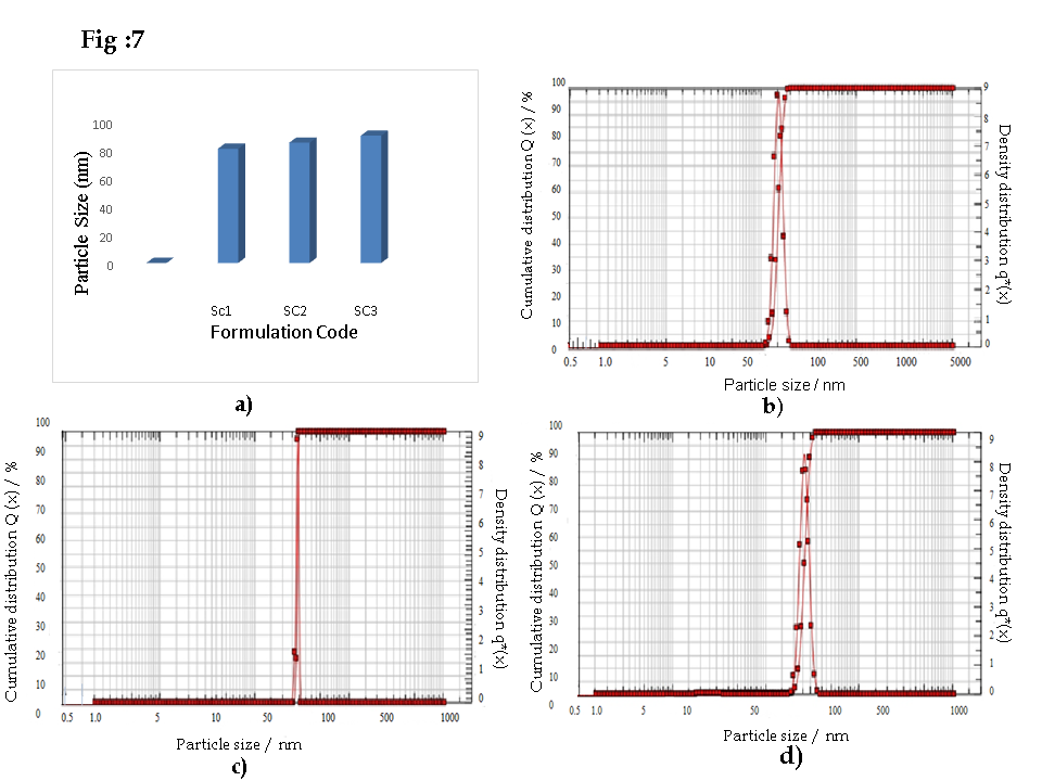 Fig. 7: Graphical representation of particle size (nm) of final batches of SC, b): Particle size 80.52±6.8 (nm) of a final batch of SC1, b): particle size 84.82±11.3 (nm) of a final batch of SC2, c): particle size 89.78±14.7 (nm) of a final batch of SC3