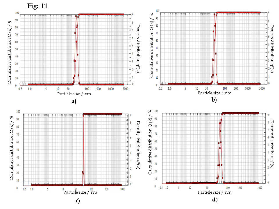 Fig. 11: Particle size determination for stability assessment, a) Particle size = 80.52 nm at the time interval of 0 d, b) Particle size = 80.58 nm at the time interval of 30 d, c) Particle size = 81.36 nm at the time interval of 60 d, d) Particle size = 82.36 nm at the time interval of 90 d