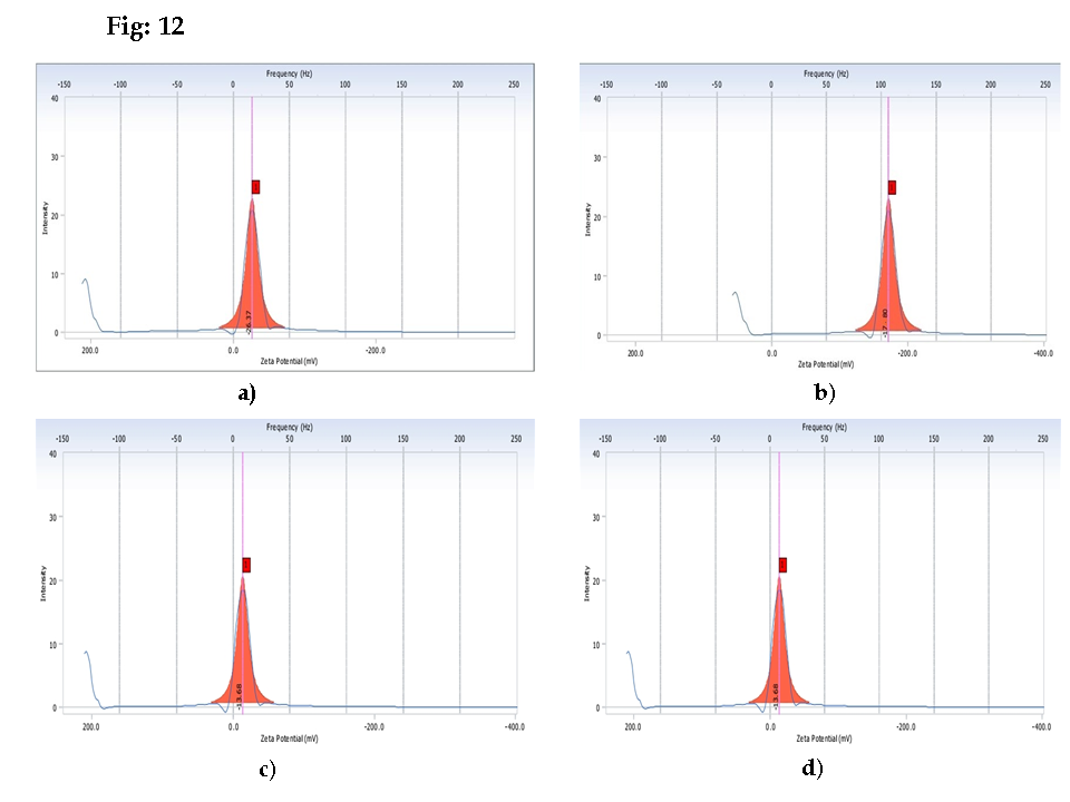 Fig. 12: a)Zeta potential is 26.37 mV at the time interval 0 d, b)Zeta potential is-17.80mV at the time interval 30 d, c) Zeta potential is-13.68mV at the time interval 60 d, d) Zeta potential is-13.68mV at the time interval 90 d