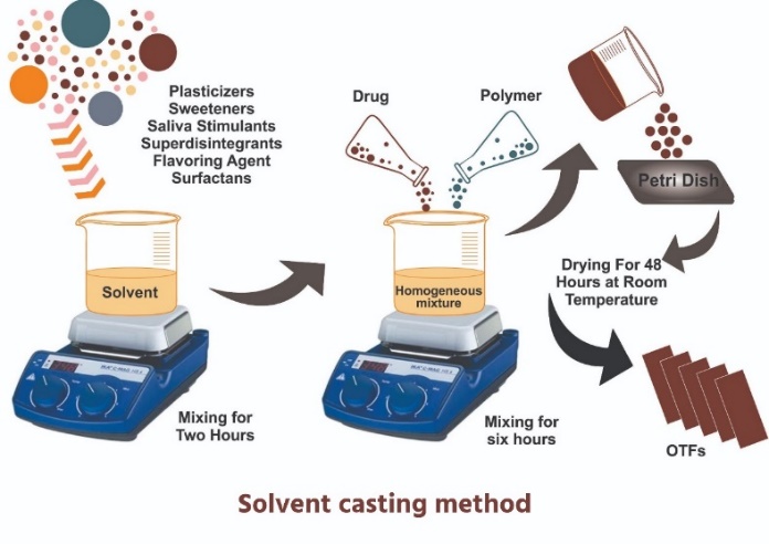The most widely used technique for creating OTFs is solvent casting, which has low processing costs, straightforward application, and easy preparation [32]. To put it briefly, components that dissolve in water are made by combining them in a heated magnetic stirrer. To create a viscous solution, the medication and additional excipients are then added to this mixture. This method's solution is put into a petri dish, and the solvents are left to evaporate. These are stored for 20–25 or 24-48 h at room temperature or for a shorter time at 40–50 °C in the oven, according to the solvent system that was used. After the solvents evaporated, 15-20 mm diameter and 0.2–0.3 mm thick films were carefully removed from the petri dishes. [33]. They are cut into the appropriate size pieces based on the concentration of active ingredients they contain.1,7 Using gel-forming polymers, the semisolid gel mass is dried after being poured into appropriate molds in the solvent casting technique. After that, they are ready by being cut into the appropriate sizes [34, 35]. They have about 90%±used this technique for the formulation of OTF. The advantage of this method is to get film of uniform thickness and it is quite flexible. The cost of this method is also very low [36, 37].