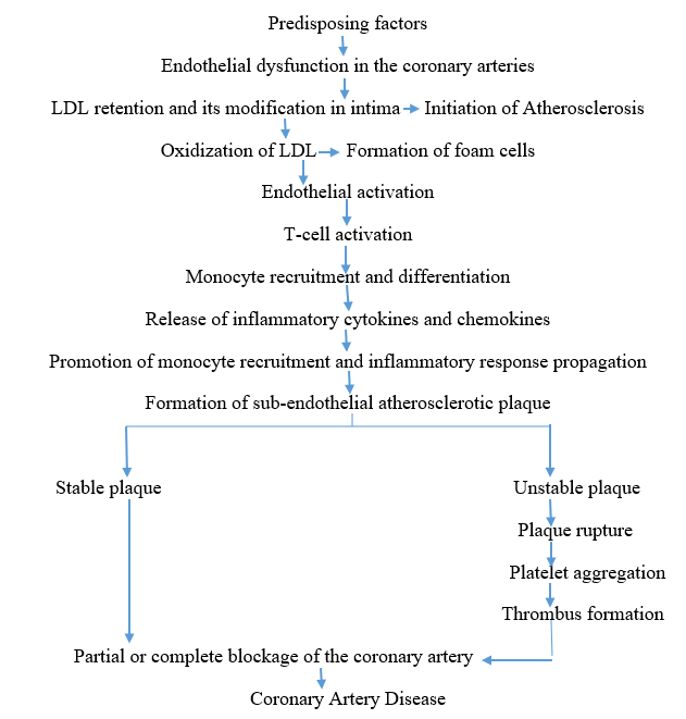 The gradual formation of atherosclerotic plaques within the coronary arteries, which results in decreased blood flow to the heart muscle, is the hallmark of CAD, a complicated cardiovascular illness. Atherosclerosis develops and spreads as a result of a number of interconnected mechanisms that make up the pathophysiology of CAD [3].