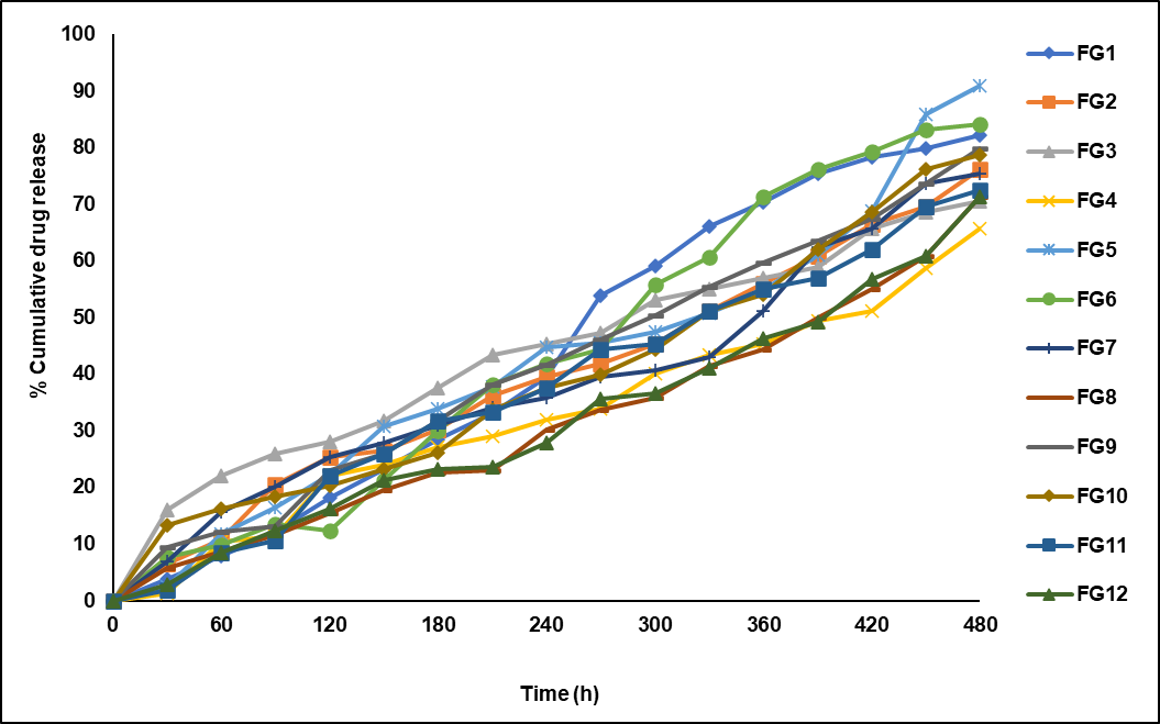 Fig. 11: In vitro diffusion study of fluconazole nanosponge hydrogels FG1–FG12*. N=3, error bars were omitted