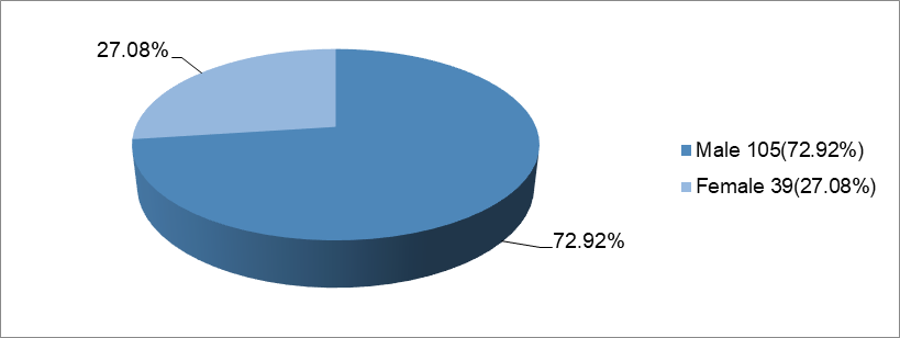 In the present study, 144 patients were enrolled and their prescriptions were analyzed during 3 mo. We observed that there were 697 drugs prescribed and the average number of drugs per prescription was 4.84. Out of 144 patients enrolled, 105 (72.92%) were male and 39 (27.08%) were female (fig. 1). Demographic details revealed that the patients of age between 21-40 y were more (56 patients) followed by 41-60 y (41 patients), then 0-20 y (36 patients) and 61-80 y (11 patients) (table 1). This described the effect of age factor on disease distribution. The mean age of the patients was 35.04±18.53. The majority of the patients who were admitted in-patient ward of the Orthopedics Department had suffered from a fracture of limbs i.e. 84(58.33%), followed by 38(26.39%) patients with other orthopedic ailments,15(10.42%) patients with soft tissue injury, 4(2.78%) patients with osteomyelitis and 3(2.08%) patients with congenital anomalies (fig. 2). Analgesics were the most commonly prescribed drugs in the Orthopedics Department. There were 190 analgesics (27.26%), followed by 169 antibiotics (24.25%), 119 gastroprotective drugs (17.07%), 80 miscellaneous drugs (11.48%), 57 Calcium and Vitamin D (8.18%), 51vitamins (7.32%) and 31 antiemetics (4.45) (fig. 3).