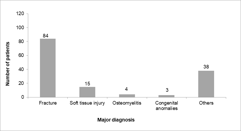 Results: Out of 144 patients enrolled, 105 (72.92%) were male and 39 (27.08%) were female. Maximum patients were between 21-40 y of age. The mean age of the patients was 35.04±18.53. The average number of drugs per prescription was 4.84. Fracture of limbs (58.33%) was the most common diagnosis. Analgesics were the most commonly prescribed drugs. Diabetes was the most common comorbidity. The percentage of drugs prescribed by generic names was 48.06, and that from the essential drug list was 47.78. The percentage of fixed-dose combinations used was 28.55.