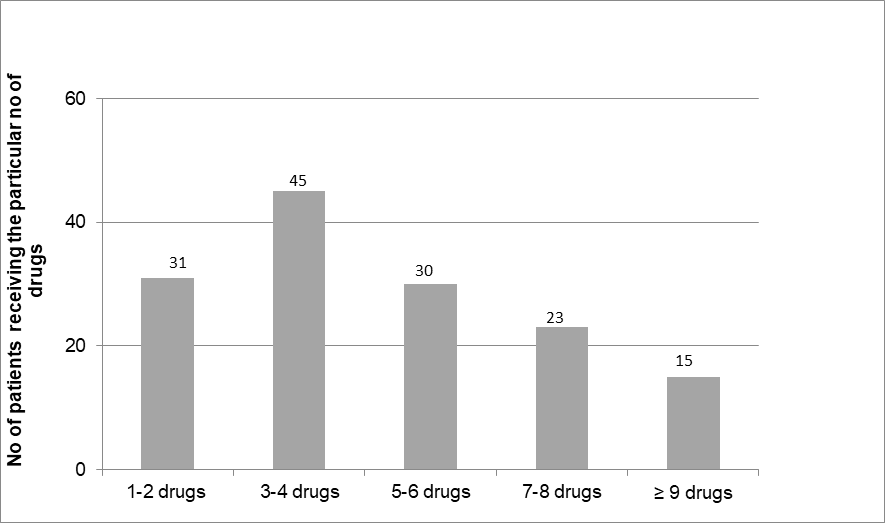 The rationality of a prescription can be evaluated by the total number of drugs prescribed for a patient. The more the number of drugs prescribed, the more the development of resistance, adverse drug reactions and other drug-related problems. Indirectly it may affect the patient’s adherence towards treatment. However, according to the severity of the disease, multiple drugs are prescribed for the treatment [13]. In the present study, 45 patients (31.25%) were prescribed with 3-4number of drugs, followed by 31 patients (21.53%) with 1-2 drugs,30 patients (20.83%) with 5-6 drugs, 23 patients (15.97%) with 7-8 drugs and 15 patients (10.41%) with equal or more than 9 drugs (fig. 4).