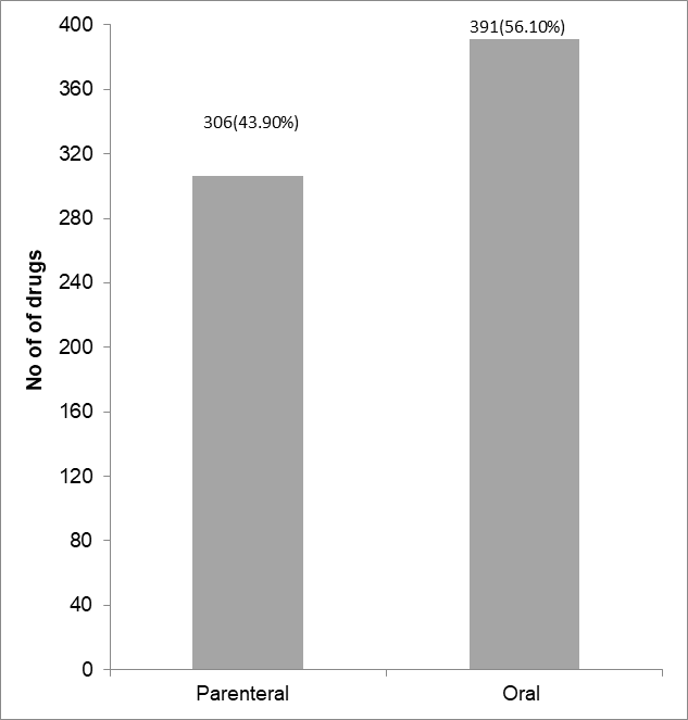 In this study out of 697 prescribed drugs, 391 drugs were given orally and 306 drugs were given parenterally as shown in fig. 5.