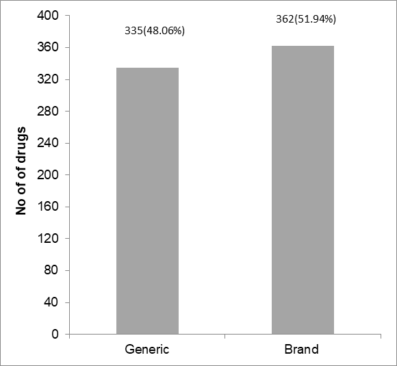 In this study, out of 697 prescribed drugs, 335 drugs were prescribed by their generic names and 362 drugs were prescribed by their brand names as shown in fig. 6.