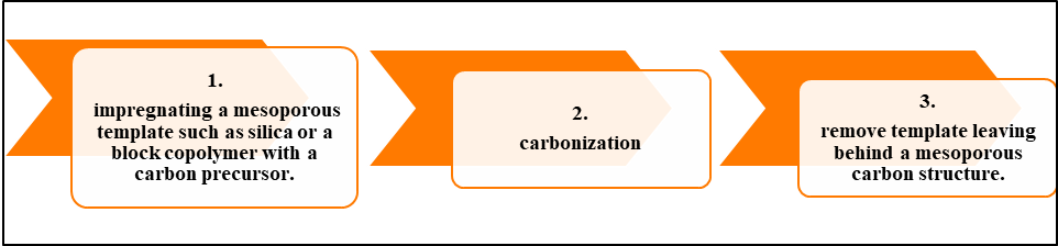 One significant component of mesoporous materials is mesoporous carbon. Its pore diameter typically ranges from 2 to 50 nm, and its pore dispersion is uniform. Its specific Surface area is high and its pore structure is regular. In addition, it has chemical and thermal stability [45-46]. The most common approach for synthesizing mesoporous carbon is template-assisted synthesis [47]. The following is the standard template synthetic process for porous carbons: