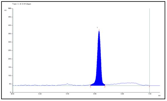 Fig. 3a: EVR after basic degradation, Rf of EVR = 0.63, Rf’s of DP 1-0.02, DP 2-0.15, DP 3-0.41 (Amount Spotted: 2000 ng/band)