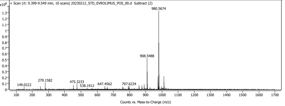The fragment ions observed in the mass spectrum exhibited characteristic peaks corresponding to the cleavage of specific functional groups within the molecule. The major fragment ions observed were consistent with the loss of various moieties, such as methyl groups, methoxy groups, and carbonyl groups. The mass fragmentation results provided important information for the structural elucidation and identification of everolimus standard, contributing to the comprehensive understanding of its degradation pathway.