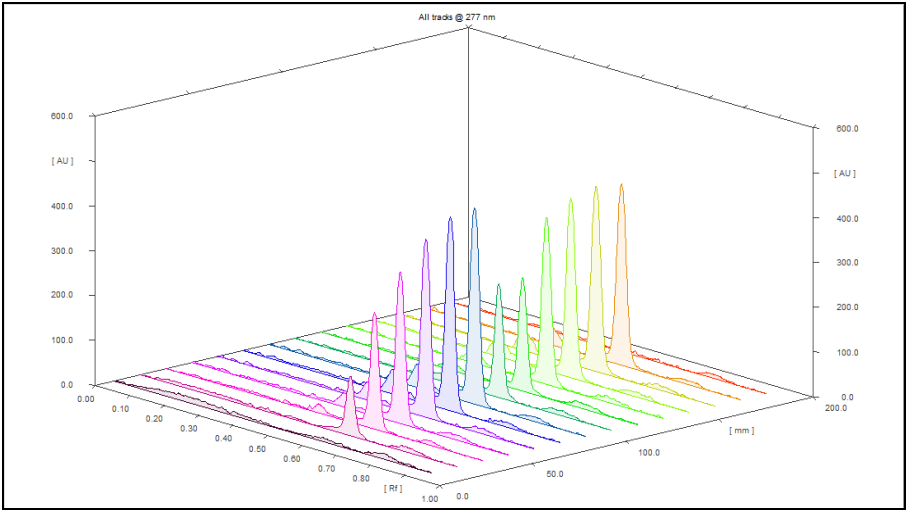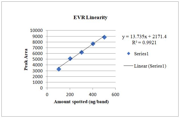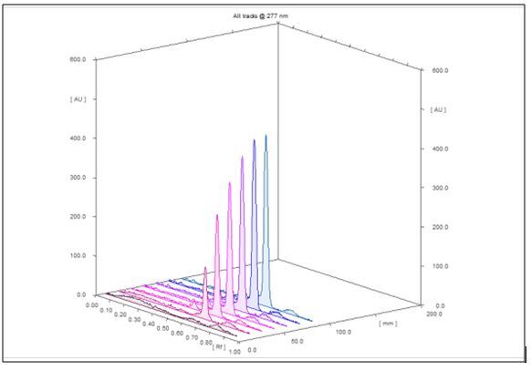 Everolimus standard (20 µg/ml) was applied on the TLC plate of the volume 5, 10, 15, 20 and 25µl, thus leading to spotted amounts. The range was 100-500 ng/band. After being saturated in an optimised mobile phase for 10 min, the plate was developed, and this process was repeated five times. For linearity, the 3D densitogram was displayed in fig. 8. Calibration curve here was created by graphing the peak area in fig. 9 against the amount of drug observed (ng/band).