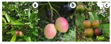 Fig. 1: C. carandas fruit varieties, a: green, b: pink, c: sweet variety