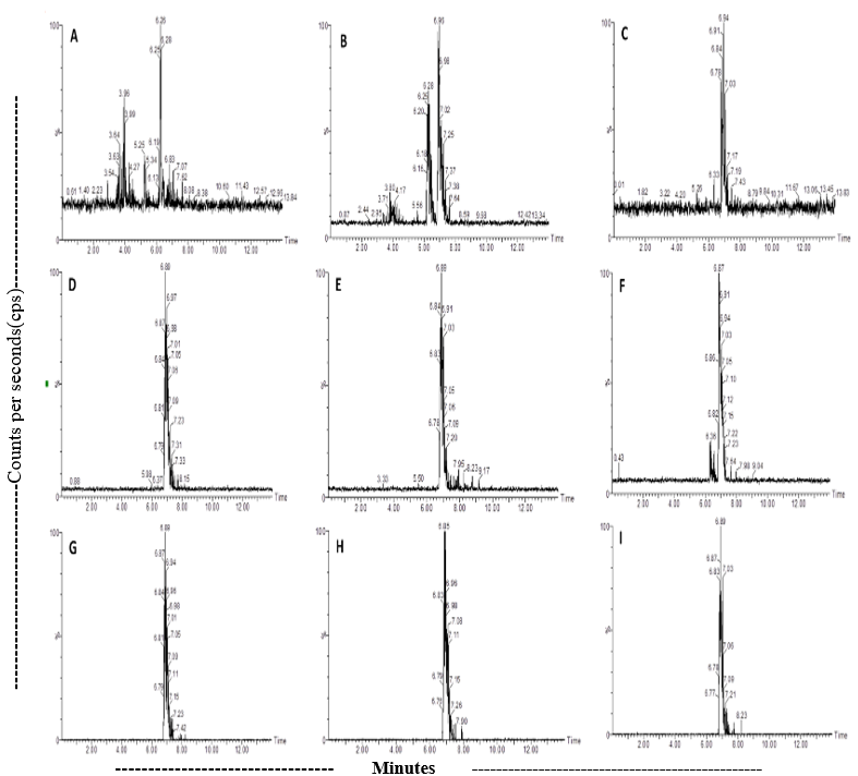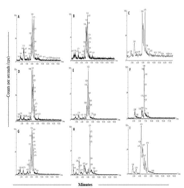 Fig. 3: Chromatogram details of flavonoids present in C. carandas fruit extract analyzed by LC-MS. A, B and C indicates samples of sour green aqueous, methanol and ethanol extracts. D, E and F showed the results of sour pink aqueous, methanol and ethanol extracts. G, H and I indicate the sweet variety aqueous, methanol and ethanol extracts