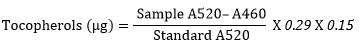 The levels of tocopherol in the samples were estimated spectrophotometrically by the method reported by Rosenberg (1992) [15]. The liver homogenate, standard and water of 1.5 ml were pipetted out into three centrifuge tubes namely test, standard and blank respectively. To all the tubes, 1.5 ml ethanol and xylene were added, stoppered, mixed well and centrifuged. After centrifugation, the xylene layer was transferred into another tube, taking care not to include any ethanol or protein. To 1.0 ml of xylene layer, 1.0 ml of 2, 2′-dipyridyl reagent was added and mixed. This reaction mixture was taken in the spectrophotometric cuvettes and the extinctions of the test and the standard were read against the blank at 460 nm. Then, 0.33 ml of ferric chloride solution was added, mixed well and after exactly 15 minutes, the test and the standard were read against the blank at 520 nm. The levels of tocopherol were calculated using the formula